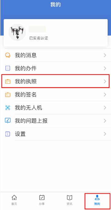 在首页右下角点击 “我的” 进入个人中心,选择 “我的执照”,即可查看与网页端一致的执照信息。