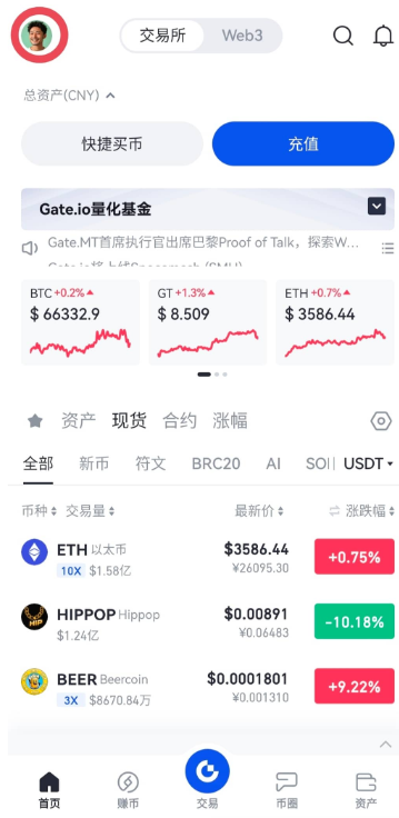 1、打开Gate.io App,登录个人账户,选择左上角的“用户中心”。