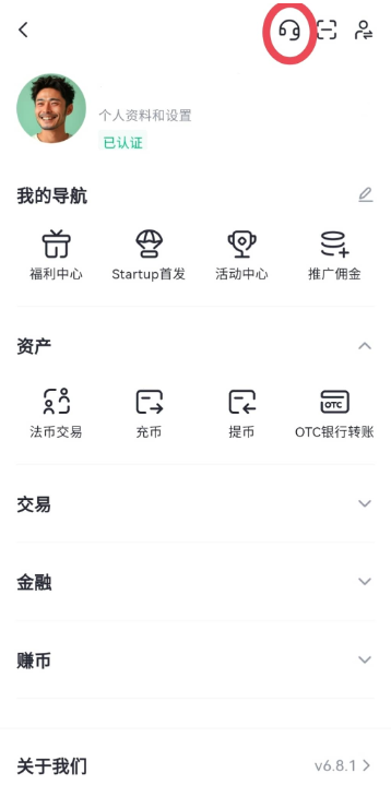 1、打开Gate.io手机App,登录个人账户,点击左上角“头像”,再点击右上角“耳机”图标后,点击“联系客服”。