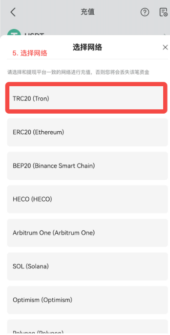 选择网络/区块链类型,您将看到每个区块链相应的交易手续费。请确保选择与接收平台/交易平台相同的网络。