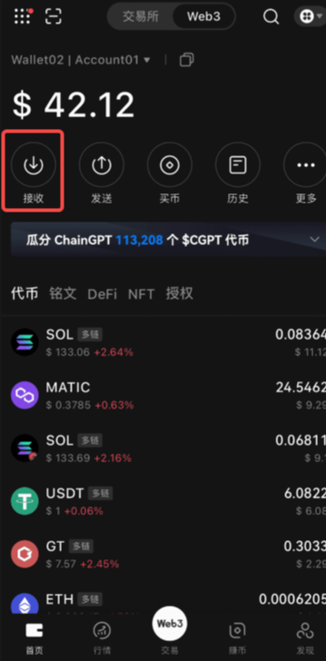 第一步:打开web3 App,进入Web3界面,点击页面中【接收】