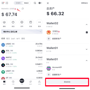 点击钱包首页右上方倒三角按钮,进入钱包资产页面,点击下方【添加钱包】。