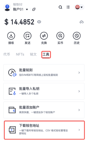 1.打开区块链app插件钱包,点击页面中「工具」一栏 → 选择「下载钱包地址」