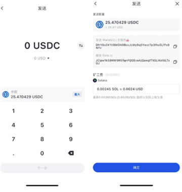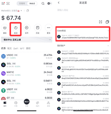 点击钱包首页【发送】,选择发送代币。进入发送页后,选择【区块链app地址】,填入发送数量,确认代币数额、钱包地址、Gas费无误后点击【确定】即可转账至Gate.io账户。