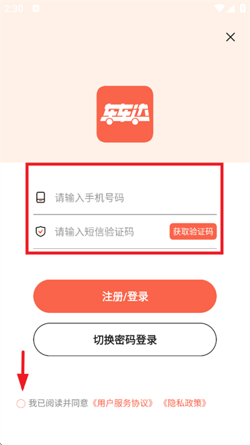 3、输入手机号和验证码,勾选用户协议和隐私政策即可