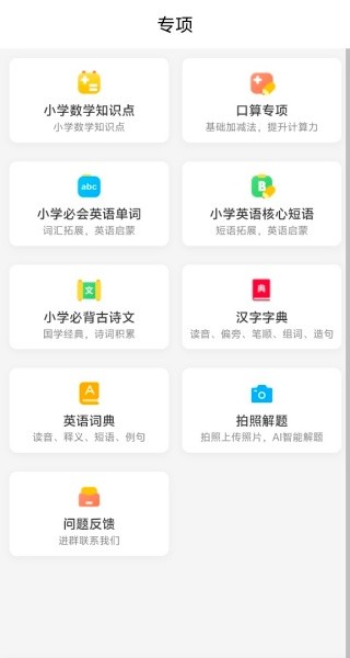 - 趣味刷题:每日一练、专项训练、错题重做多种模式,口算、单词、古诗等专项训练,游戏化学习告别枯燥。