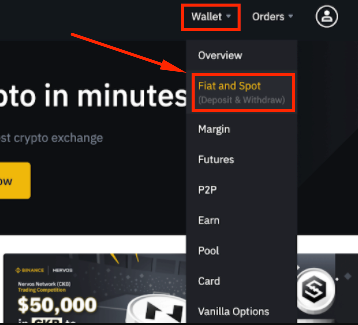1,登录个人币安账户。登录成功后,将鼠标移至[钱包],点击[法币和现货]。