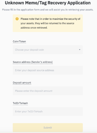 如果您在没有MEMO、标签或支付ID的情况下将加密货币存款转入了正确的地址,则可借助自助服务表格取回资金。为此,需要填写一些与交易相关的基本信息,包括TxID、金额和汇款人地址。此流程仅在区块链充分确认交易时有效。