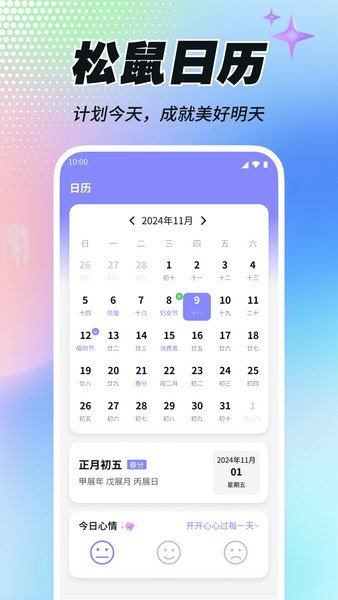 松鼠日历app最新版是一款集日期查询、日程管理、天气整合等功能于一体的工具软件,其核心功能包括公农历切换、节气查询、提醒备忘等,并融入传统黄历的宜忌、生肖文化元素,起源于中国古代历法体系,电子日历通过整合天气定位、云同步、多端提醒等数字化服务,成为现代生活管理的重要工具