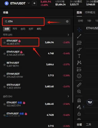 3,在搜索框输入ETH,选择ETH/USDT交易对,可以看到ETH实时行情