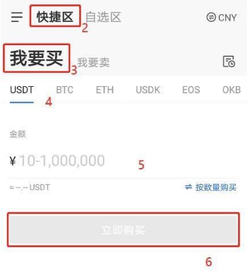 点击首页下方法币按钮,进入法币交易区,选择快捷区,我要买,选择要购买的币种,输入要购买的总金额或要买的币种数量,点击立即购买。