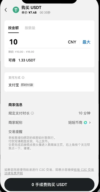 二、选择可交易的商家进行购买-按金额或者数量填写所需的数字资产-注意商家要求的“支付方式”-注意商家要求“支付时长”-点击“0手续费买入”-订单生成点击“获取付款详情”-按照“商家账号”进行支付-付款成功后点击“我已支付”-点击“确认已转账”-商家收到款会进行放币