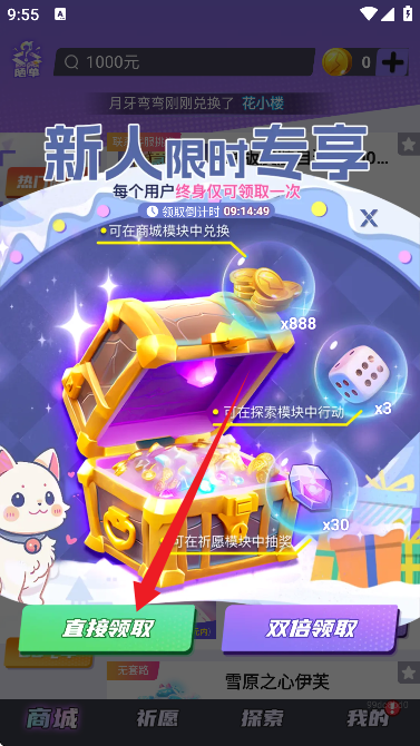 2、进入到软件首页,如图所示。作为新用户会有一次免费领取游戏皮肤的奖励。可以直接领取。