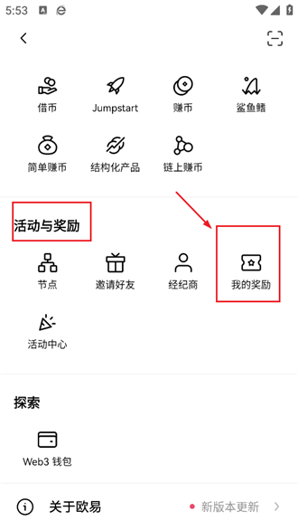 2,进入之后往下滑到【活动与奖励】,点击【我的奖励】进入;