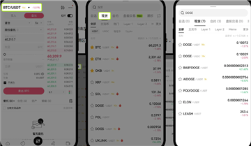 以狗狗币DOGE为例:打开APP,进入【交易】页面 — 点击左上角币对框【BTC/USDT】;