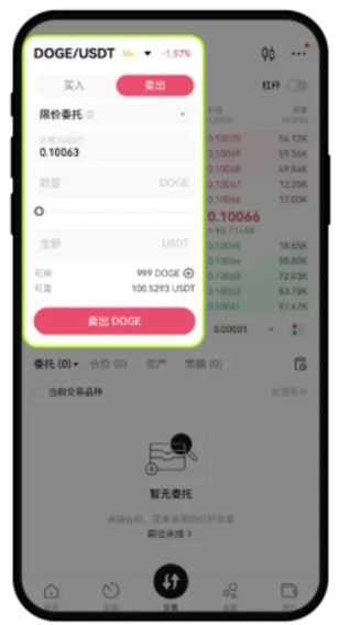 选择【卖出】—【限价委托】— 输入【价格】、【数量】—点击【卖出DOGE】—【确定】。