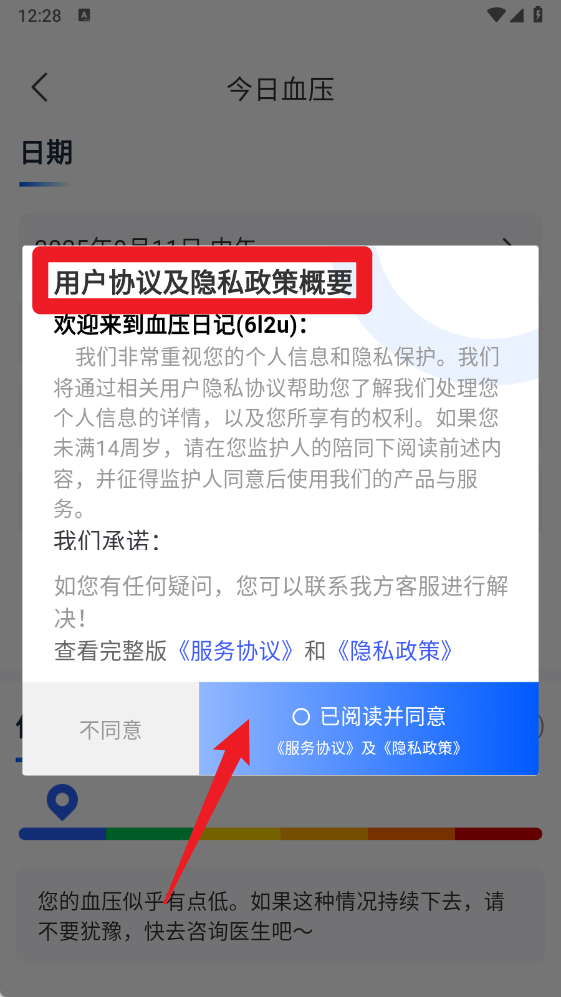 1、首次进入血压日记 APP,会显示【用户协议及隐私政策概要】,用户需阅读并点击【同意】才能继续使用。