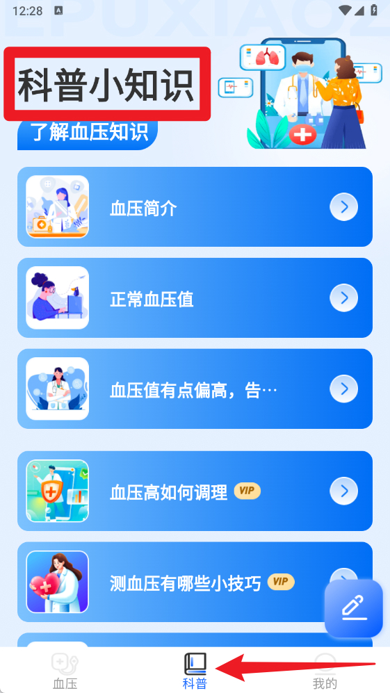 4、切换到【科普小知识】版块,可以浏览血压基础知识、正常血压值及血压调理方法,部分为 VIP 内容。