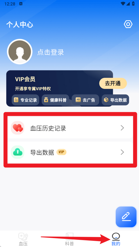 5、在【我的】页面,可以查看血压历史记录、管理个人信息,并支持数据导出(VIP 专属功能)。