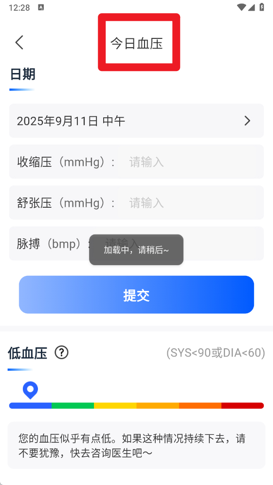 3、进入【今日血压】页面,手动填写血压与脉搏数值后提交,系统会给出健康提示。