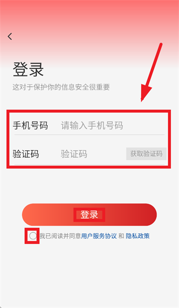 跳转至登录界面,输入手机号,验证码,勾选我已阅读并同意用户服务协议和隐私政策,点击登录进入后使用即可