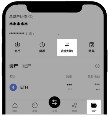 打开欧易 APP,点击【资产】—【资金划转】,选择币种以【USDT】为例 — 从【资金账户】— 到【交易账户】— 输入划转【数量】—【确定】。