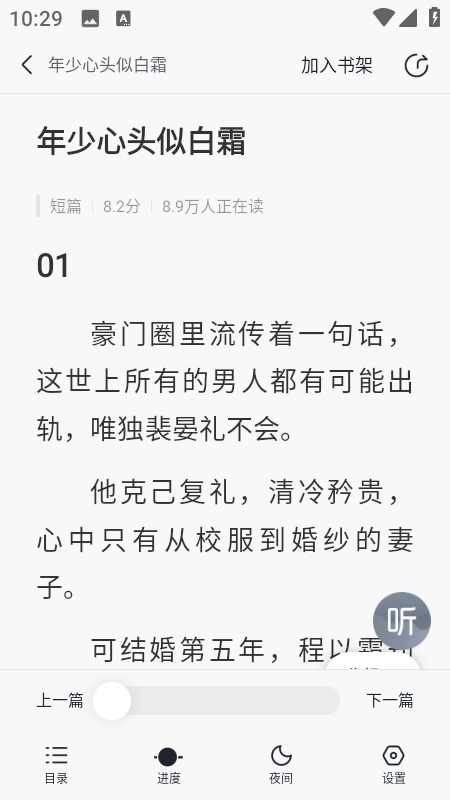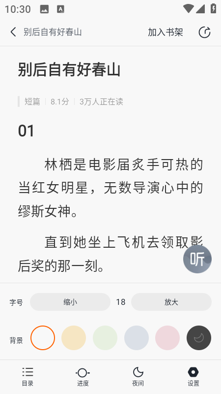 1、打开软件,选择一本书籍点击进入阅读状态,然后点击屏幕空白处,再点击右侧【听】按钮