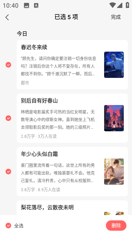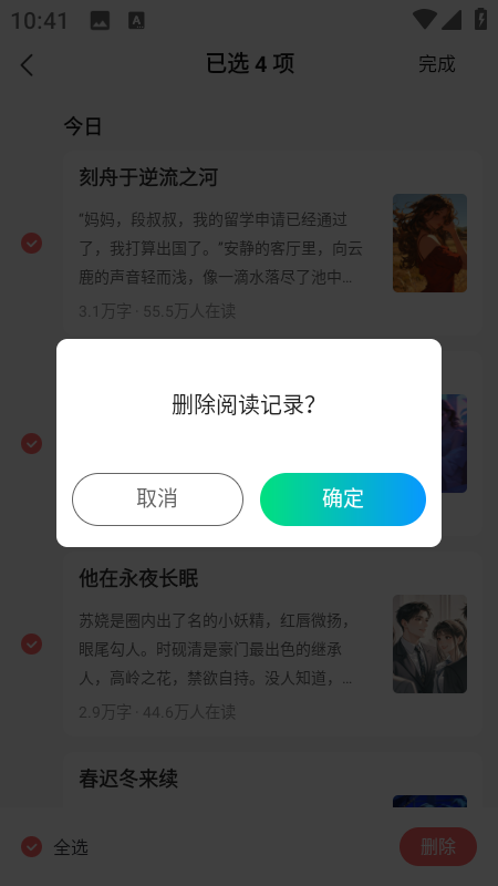 3、勾选自己需要删除的内容或点击左下角【全选】删除全部的阅读记录,然后点击【删除】,最后点击【确定】即可
