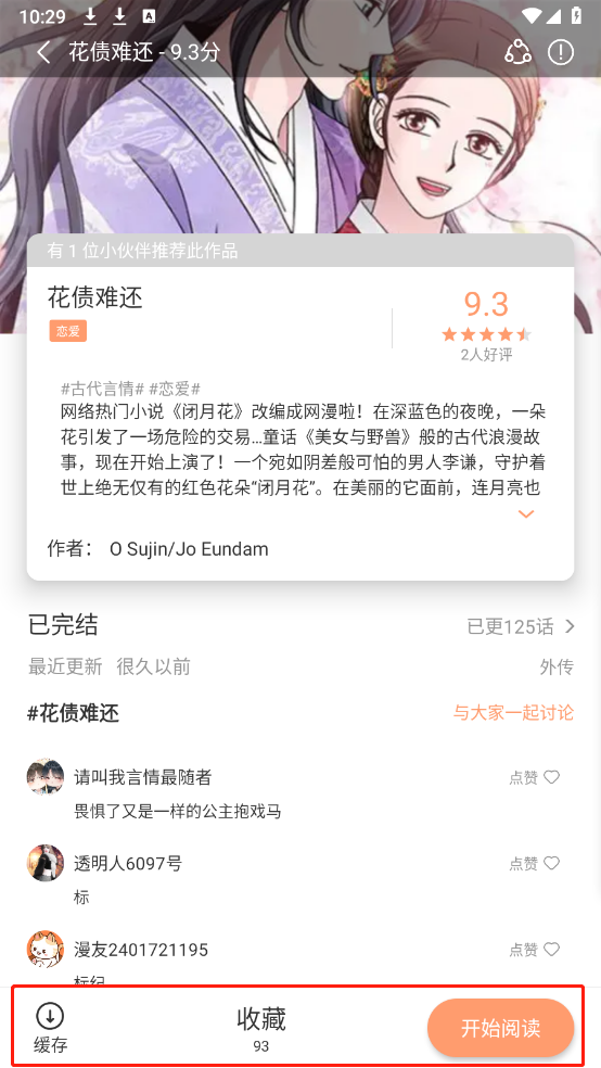 4、选择自己喜欢漫画点开,可以对漫画进行缓存、收藏以及开始阅读。