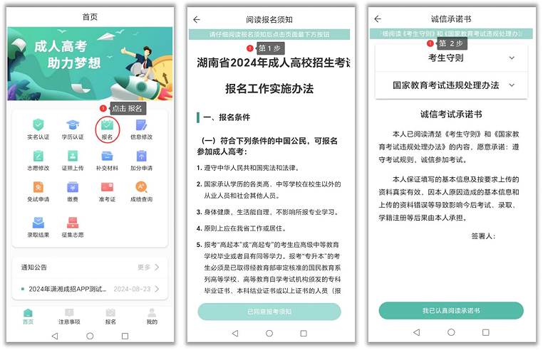 考生需按步骤完成阅读报名须知-->签订诚信承诺书-->填写名信息-->填写志愿信息-->上传相关资料(报考医卫类考生)->确认报名信息-->选择报名确认点-->填写常用手机号码->完成活体人脸比对-->报名预约成功。