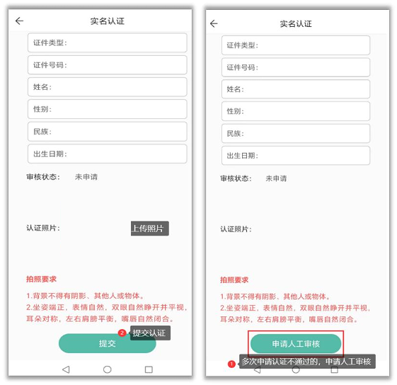 首次登录时 App 会自动进入实名认证界面,考生必须完成实名认证后才能进行报名等其他操作。进入界面后 App 会显示考生基本身份信息,考生需上传一张符合要求的照片进行公安实名认证。多次实名认证不通过的 App 会提示申请人工实名审核,申请后等待审核通过才能进入 App 主界面进行其他操作。