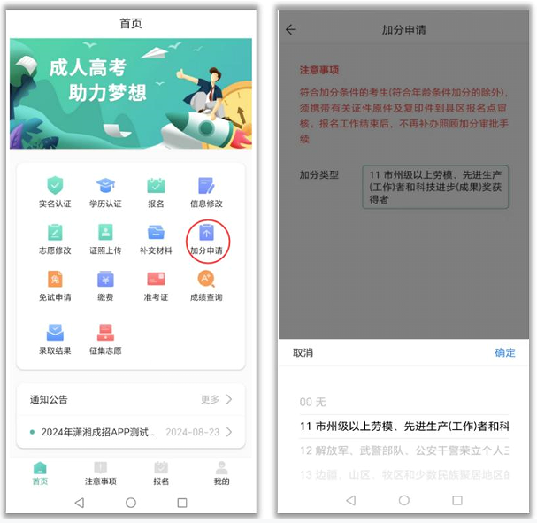符合加分条件的考生(符合年龄条件加分的除外),可以通过App 申请加分,申请后考生本人须携带有关证件原件及复印件到县区报名点审核。报名工作结束后,不再补办照顾加分审批手续。