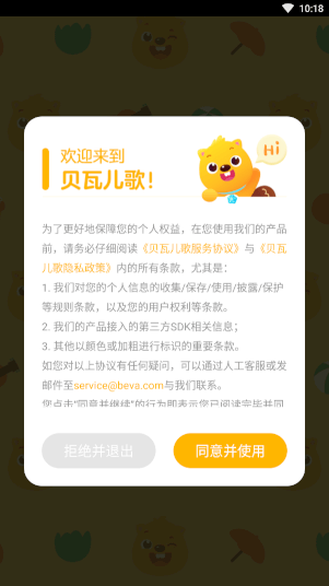 1、下载并安装打开贝瓦儿歌儿童早教app,阅读协议自行选择是否同意
