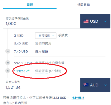 保证汇率则是Transferwise 在指定时间内为用户的汇款保证汇率,Transferwise 会给予一段时间,只要在这段时间内完成汇款,都可以获得这个保证进行汇款时的汇率, 如下图例。