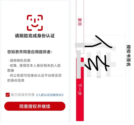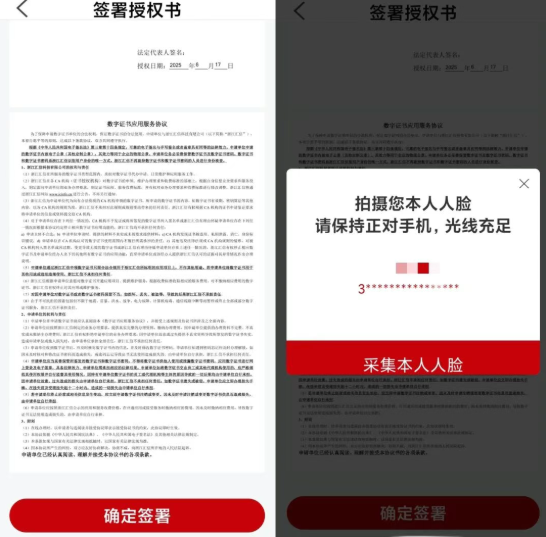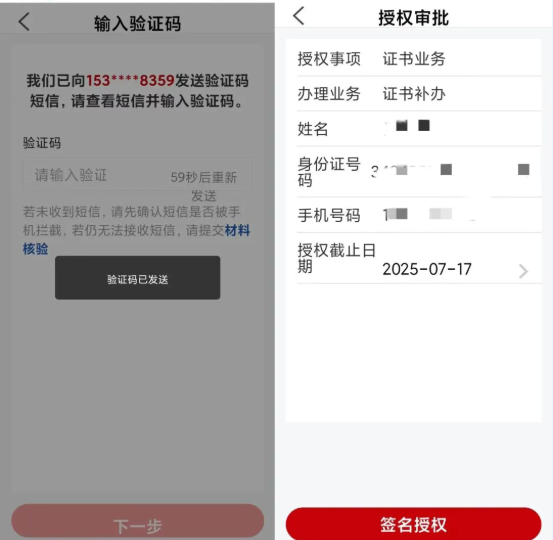 此时系统会进行法定代表人身份信息校验,校验通过后,输入短信验证码。核实经办人信息及授权期限,并完成人脸认证及签名后,授权成功。授权成功后,可进入“授权记录”中查看已授权的记录。