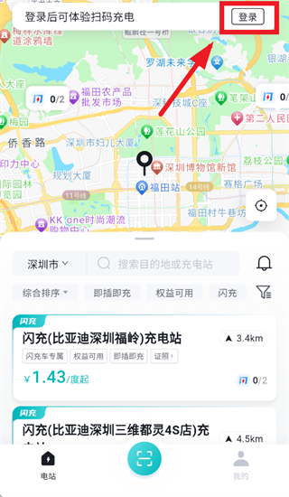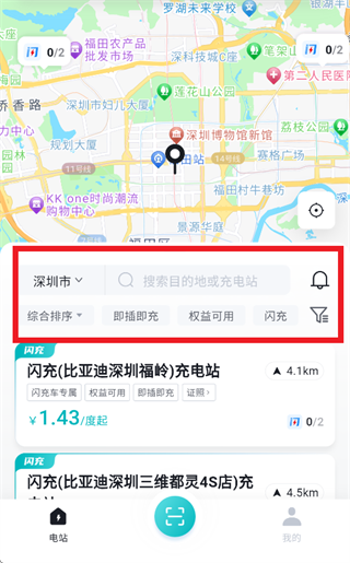 打开比亚迪闪充app,进入后可直接搜索或根据各条件筛选充电站,选择合适的充电站点击进入