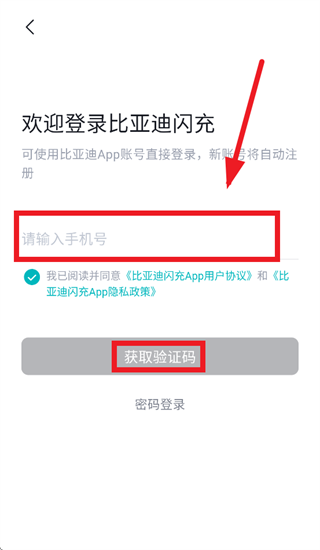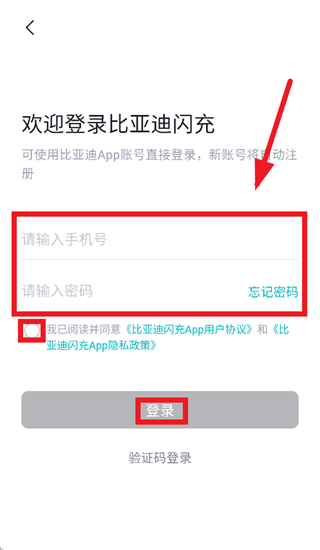跳转至登录界面后,输入手机号,密码,勾选我已阅读并同意 《比亚迪闪充APP用户协议》和《比亚迪闪充App隐私政策》,点击登录即可