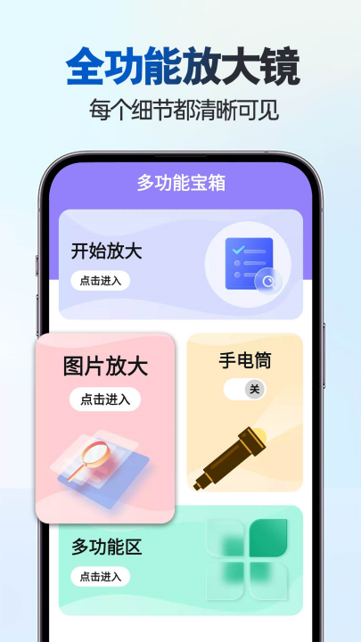 应用内置了多个方便小工具,不仅可以放大图片,还可以将手机变为放大镜,对准想要看到的地方,立刻就能放大。