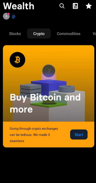 第 2 步:首先,你应该了解界面(尽管不可否认,一切都是不言自明且易于理解的)。 在顶部,你拥有自己的资产——传统股票、加密货币、商品和你的金库。在屏幕中间,你可以看到你的投资余额和投资本身。向下滚动,你将能够看到你所做的交易。 在同一屏幕上,到界面的加密部分。