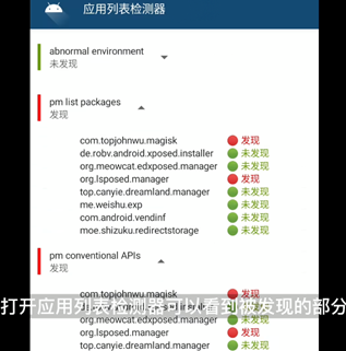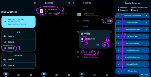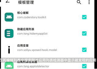 2、启动隐藏应用列表功能,进入应用管理界面,选择需要隐藏的应用,启用隐藏选项(通常通过勾选相应模板实现),最后确认设置。随后,打开“Applist Detector”检测器,查看应用是否已成功隐藏。