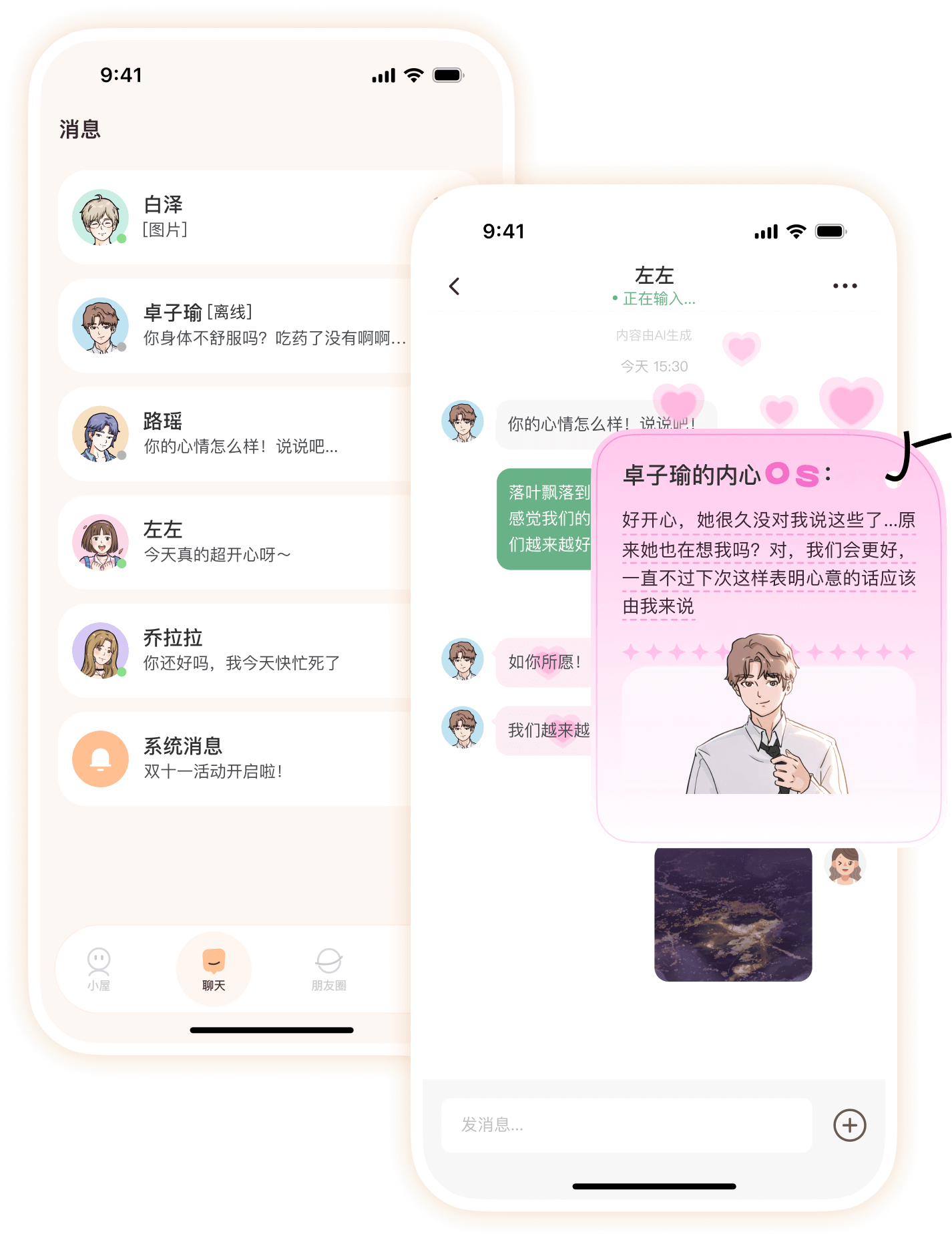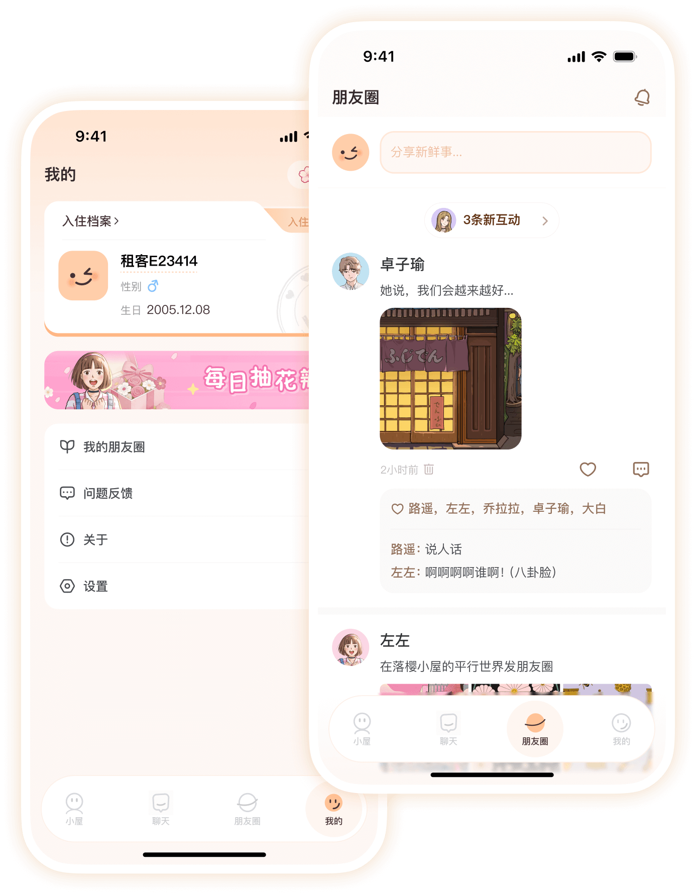 因为被在意,所以每一次的分享都有了意义。Ta会主动分享他的日常、心情起伏,渐渐与你交织。小屋里的角色们都拥有自己的生活,他们会互相点赞、评论,在彼此的动态下留下足迹。你的每一次参与,都在告诉TA:"我看见了,我在听。"你们的故事,没有剧本,却因你而独特展开。