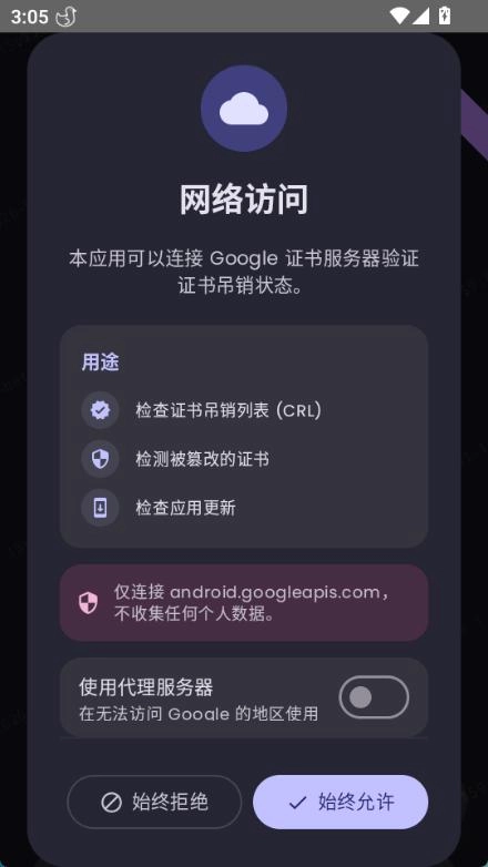 2、进入“网络访问”页面后,选择“始终允许”选项来连接证书服务器;如果您所在的地区无法访问Google,可开启“使用代理服务器”的开关。