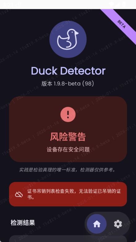4、进入duck detector主界面后,应用会自动扫描设备证书与网络环境,你能够查看检测报告,并依据提示对风险项进行处理。