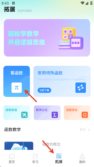 2、点击下方的拓展,选择幂函数;