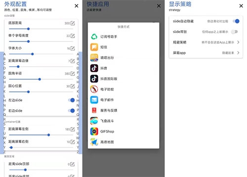 1、可自定义在哪些app上使用侧边索引栏,防止应用冲突,并且还可自由隐藏不想显示的应用