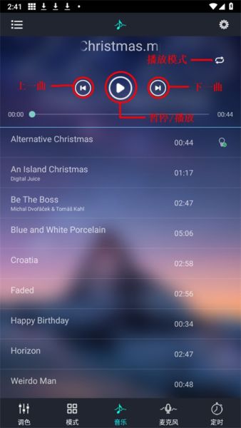 律动功能可以选择播放手机本地音乐、手机麦克风试音以及硬件麦克风试音,其中本地音乐律动需要预先下载一些音乐文件,并打开APP的本地文件访问权限。