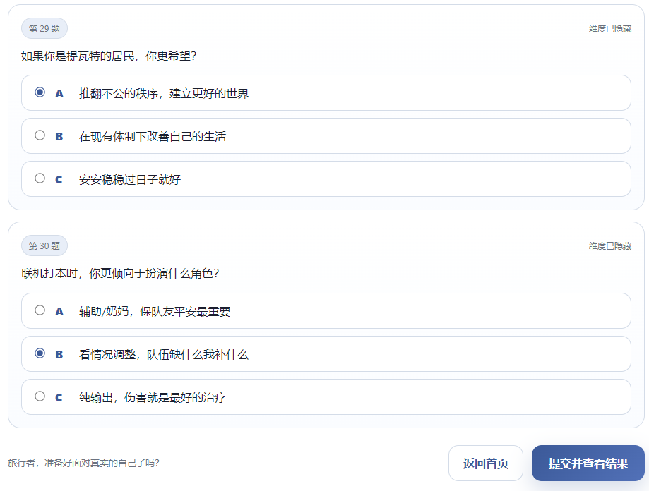 SBTI人格测试原神版是由玩家自制的原神同人测试游戏,最近在b站上面特别火,玩家只需要根据对应的步骤,做完相对应的题目,几分钟内就可以完成,系统就会自动帮你测试出你的原神人格。