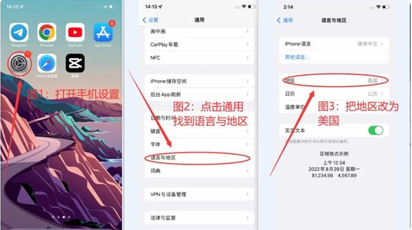点击手机设置(图1)-点击通用,找到语言与地区(图2)-把地区改为美国(图3)。