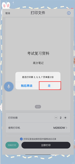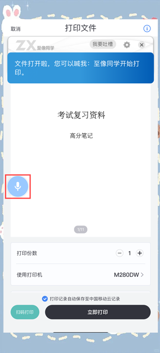 2、在打印页面,只需长按麦克风按钮,然后清晰地说出指令:“至像同学,请打印第2页、第3页、第5页以及第7页,并打印两份。”这样,你就能轻松地完成复杂的打印任务,无需繁琐的操作。