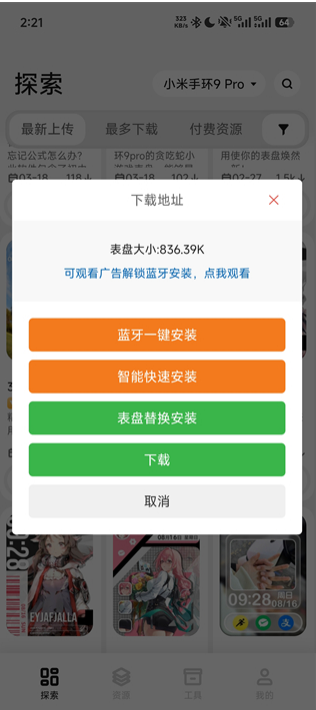 蓝牙一键安装/智能快速安装:直接通过蓝牙将表盘推送到设备(部分需观看广告解锁)。